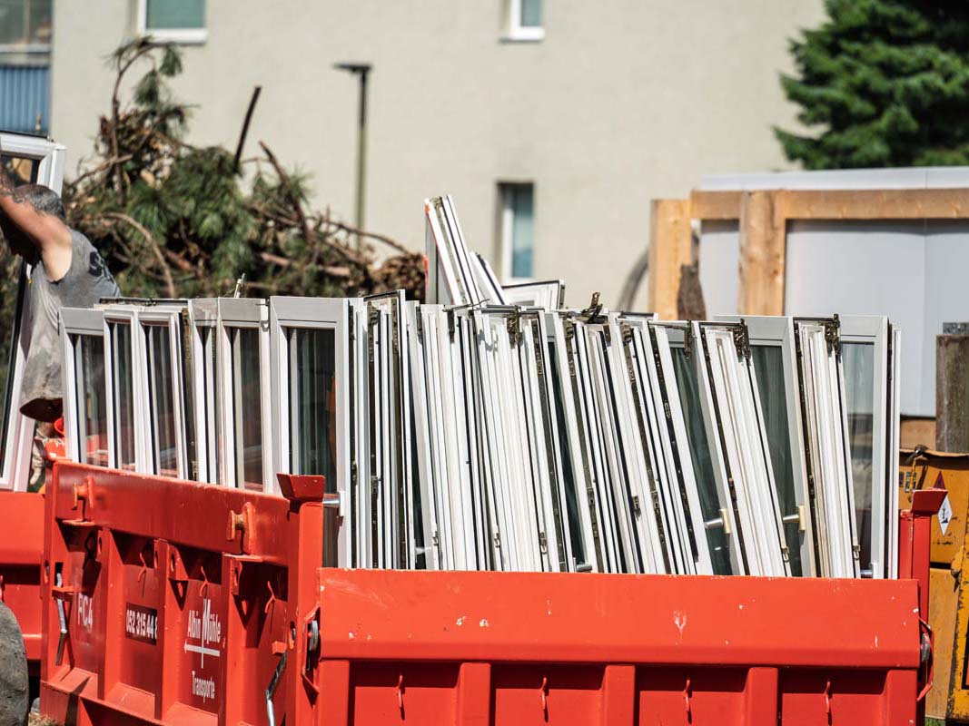 À Winterthour, les ouvrants ont été descendus à l’aide d’une pelle mécanique plutôt que transportés par les escaliers, puis stockés verticalement dans des conteneurs plats. Une exigence clé : le verre devait rester intact afin d’éviter toute contamination croisée avec d’autres matériaux.